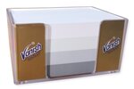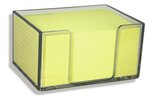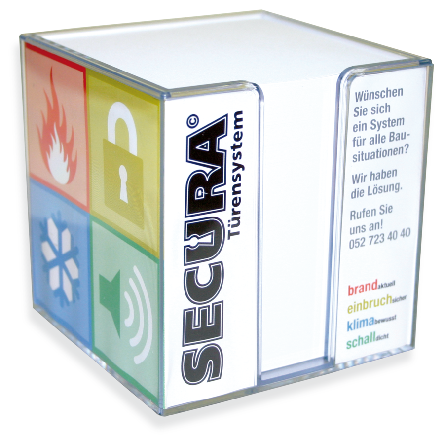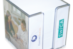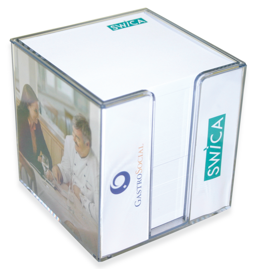 Praktische Haftnotizbox aus transparentem Kunststoff mit weissem oder individuell bedrucktem Inhalt. Auf Wunsch mit integriertem Werbebanner aus Papier (4-seitig). Bis 5-farbig bedruckbar. Die Werbung auf der Box bleibt sichtbar bis zum letzten Blatt. Kleinauflagen digital.